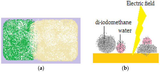 Cubic foamed-polystyrene (FPS) particles were plasma-treated in order to increase their surface energy and hydrophilicity, wetted with water and coated with hydrophobic colloidal particles. Shaped liquid marbles maintained stability both on a solid and liquid supports. These special shaped marbles do not coalesce upon contact, due to the fact that hydrophilic particle coated liquids behave as elastic solids, and not fluids. Uncommon geometrical figures are formed after two marbles are compressed together, as displayed in Figure 3a. The non-stick drop composite category is completed by water and di-iodomethane droplets covered in PTFE, which are slightly compressed together. The resulted formation shares the hydrophobic shell. As an electric field is applied, the water droplet climbs onto the di-iodomethane one which is denser, and the structure is re-shaped, as presented in Figure 3b [22].