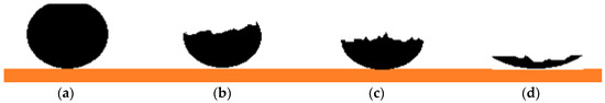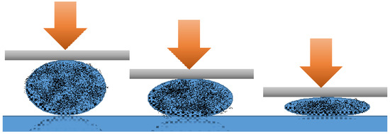 In order to test liquid marbles’ double character hypothesis, laboratory-made liquid marbles were compressed. Formulations included ultra-high molecular weight polyethylene (UHMWPE) as shell-forming particles and potassium chloride 100 mM as core liquid. The liquid marbles obtained by Samuel et al. [49] were gradually compressed, as shown in Figure 4. Video recordings showed the modifications suffered by liquid marbles, proportional with the compression force applied. Results indicated the following changes: when a small compression force was applied, liquid marbles were slightly deformed; as the force increased, the shell began to crack, until the maximum force determined the drop’s collapse. The experiment demonstrated that liquid marbles’ elasticity gained through the liquid meniscus formed between the shell’s particles, allows a compression up to 30% from the drop’s initial dimension.