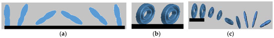 Some approaches regarding liquid marble’s surface tension take into account the particles forming the shell. Considering a layer of perfectly spherical and smooth particles with radius; they are projected towards the exterior of the drop (into the air) at a distance , given by Equation (4):