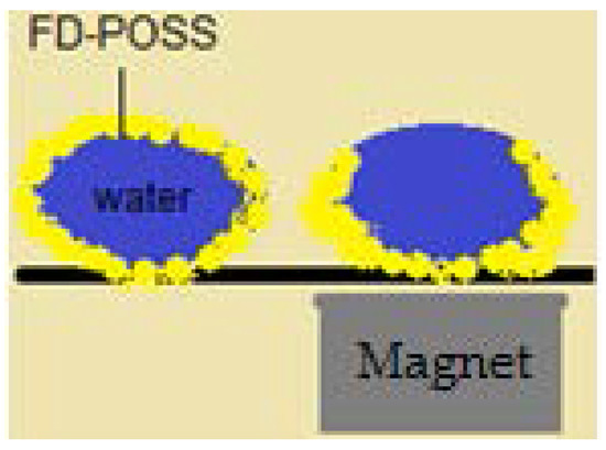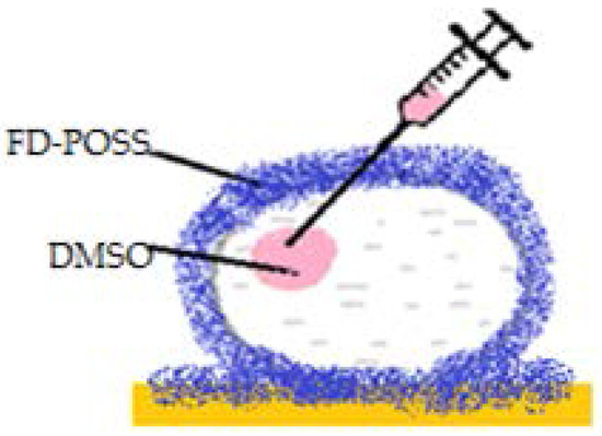 An interesting aspect worth mentioning about liquid marbles that swallow extraneous objects, is the fact that they can include millimetric particles of hydrophobized polystyrene (PS) foam. The PS is wetted with water, and the resulted drops are covered with PVDF hydrophobic particles. “Sandwich liquid marbles” are obtained, as presented by Bormashenko et al. [54]. (Figure 7). The particularity of these liquid marbles is that they can “engulf” solids, as well as liquids, respecting the condition of immiscibility. Two experimental steps are followed: forming liquid marbles with an organic fluid core, covered by FD-POSS; injecting the previously obtained marble with another organic fluid. Different pairs of organic liquids are proposed: toluene/DMSO, hexadecane/water, hexadecane/DMSO, etc. (Figure 8).