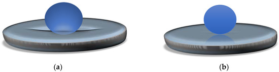 It is well known that the contact angle is described by a drop of liquid, at the liquid-solid-air interface. A contact angle at equilibrium, > 90° corresponds to a hydrophobic surface, respectively <90° to a hydrophilic one and can be calculated using Young’s equation (Equation (1)). The contact angle depends on the surface tensions delimiting the system. Surface tension determines the drop’s shape, as a result of uncompensated forces of the molecules at the edge of the drop. It practically turns the drop into a sphere: