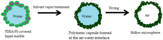 Special techniques, such as chemical vapor deposition (CVD), are applied to ionic core liquid marbles, in order to obtain a complete polymeric shell. Although the technique is usually applied to solid surfaces in order to cover them in thin films, Bradley et al. [23] used it to cover droplets. The thermodynamical stability of the system is given by surface tension and solubility effects. The condition for achieving stable polymeric-coated marbles relates to the surface energy, which should allow spreading of the polymer over the entire core liquid. It was demonstrated that in order for polymerization to happen at the liquid core’s surface, the monomer should not be soluble in the liquid. Otherwise, since the monomer establishes the polymerization site, the reaction would occur both on the liquid-air interface and inside the core liquid, which is an unwanted process. The CVD technique promises emerging applications in optics, sensing and developing hybrid materials. Experiments carried out by the same authors, revealed that the polymeric shell’s height and roughness are inversely proportional to the liquid core’s viscosity and polymer deposition rate. By varying these parameters, CVD can be used to obtain microstructured film shells is suitable for potential applications in tissue engineering, electrolyte membranes and separations [24]. Some changes in the shells’ architecture result in increasing liquid marbles’ stability. Examples show transforming from a granular arrangement into a thin film by exposing to solvent vapors, or peptide units self-assembling triggered by pH changes in the interior of the drop’s shell. Besides polymeric hollow capsules, fatty acid and triacylglycerol crystal based liquid marbles are transformed into capsules through heating [14].
