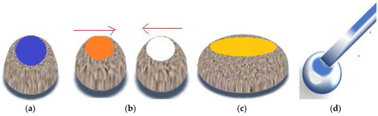 Coalescence of liquid marbles connected through a glass bar represents a track to obtaining liquid marbles resembling Janus particles i.e., marbles with shells delimited into two zones with different hydrophilicities: one hemisphere is dielectrical and the other is a semiconductor (carbon black) (Figure 3). The entire formation is activated by an electric field [20]. “Sandwich liquid marbles” including solid particles and also organic liquids have many applications in the biomedical field (liquid marbles with separate compartments, containing microorganisms, cells, reactants) [55,56,57].