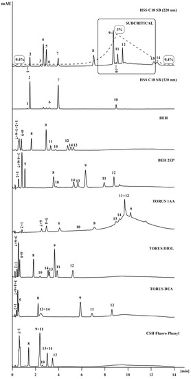When the temperature is increased at a constant pressure, changes in the solvent strength are observed. The retention depends on the temperature mainly due to the thermodynamic parameters of sorption. Changing the column temperature also has an influence on the diffusion coefficients, which increase with increased temperature [28]. The temperature of the column was studied in the range 35 °C−45 °C. If a number of compounds is separated during one analysis, usually increasing and decreasing the temperature can increase the resolution for one set of peaks and lower the resolution for the second set of peaks. This is shown in Figure 3. The temperature of 45 °C increased the resolution between the vitamin K isomers, but caused the co-elution of retinol (peak 10) and γ‑tocopherol (peak 11). Changing the column temperature from 45 °C to 35 °C increased the resolution between cholecalciferol (D3) (peak 13) and ergocalciferol (D2) (peak 14), as well as the vitamin K isomers to accepted values. Moreover, retinol (peak 10) and γ‑tocopherol (peak 11) were separated at the temperature of 35 °C. The separation of fat-soluble vitamins was also studied with a column temperature of 30 °C and 40 °C (data not shown). However, in both cases the separation on all fourteen compounds was not achieved.