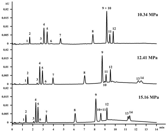 Firstly, the influence of the back pressure on the vitamin separation was studied. Increasing the pressure at a constant temperature results in an increase of the density as well as of the mobile phase viscosity. However, capacity factor decreases that may be caused by the fact that compounds may be more soluble in the mobile phase when their density is increased [28]. Moreover, reaching a higher density of the mobile phase strengthens the solvent strength for the supercritical fluid [29]. Changing the pressure from 12.41 MPa to 10.34 MPa with a constant column temperature of 35 °C resulted in the co-elution of β‑tocopherol (peak 9) and retinol (peak 10), as well as the extension of vitamin D compound retention. On the other hand, it is well known in the field of SFC that when using a modifier with a mobile phase, the increase of the pressure does not improve the separation, which is proved in Figure 2.