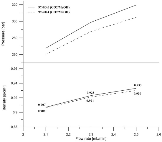 Inlet pressure and density of the mobile phase vs flow rate on the HSS C18 SB (high strength chemically modified silica) column at two different compositions of the mobile phase. ABPR was set at 12.41 MPa and column temperature at 35 °C.