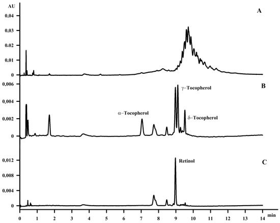 Due to the lack of information on the content of vitamins in waste fish oil, it was chosen as the second material for the study. In previous studies, the content of fat-soluble vitamins was determined only in oils from different fish species [7]. However, waste fish oil is still a valuable material not only in terms of fatty acids, such as n-3, but also in terms of the fat-soluble vitamins that are present in such oil, as found in this paper. Furthermore, the content of fat-soluble vitamins constitutes the minor part of the waste fish oil, which presents some difficulties regarding identification. This is why, similarly to the case of hemp seed oil, the same saponification procedure was applied to waste fish oil and was found to be an excellent method for both the identification and purification of fat-soluble vitamins. The identified compounds were α‑tocopherol, γ‑tocopherol, δ-tocopherol and retinol, with a content of 0.3% (wt %), 2.4% (wt %), 0.27% (wt %) and 1.4% (wt %) of total waste fish oil after purification, respectively (Figure 6).