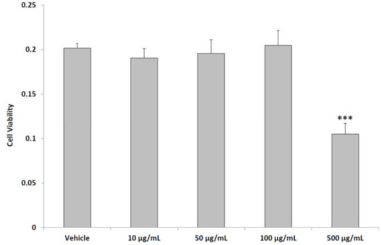 Effects of aqueous pollen extract (10–500 μg/mL) on PC3 cell line viability (ANOVA, p < 0.0001; post-hoc test *** p < 0.001 vs. vehicle group).