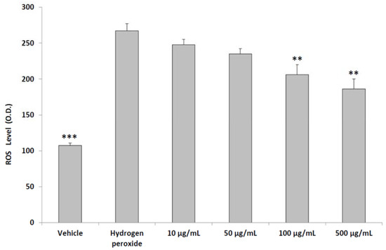 Effects of aqueous pollen extract (10–500 μg/mL) on ROS production from PC3 cell line (ANOVA, p < 0.0001; post-hoc test ** p < 0.01, *** p < 0.001 vs. hydrogen peroxide group).