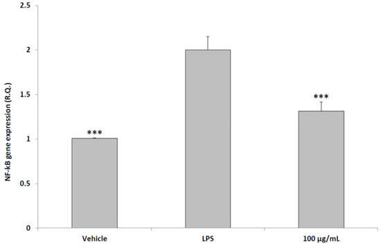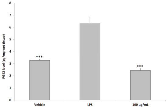 The in vitro antioxidant effects induced by the pollen extract are consistent with the reported antiradical role of polyphenolic constituents of bee pollen [32,33]. On the other hand, it is not possible to exclude direct interactions between the treatments present in cell medium. The preliminary in vitro test revealed a valuable index of non-toxic and effective concentrations, which is useful to define the concentration for prostate tissue treatment. In a third set of experiments, we evaluated the modulatory effects using a aqueous pollen extract (100 μg/mL) supplementation on multiple inflammatory pathways, including PGE2 production and NFκB gene expression, in rat prostate specimens challenged with LPS. In this context, we evaluated the protective effect of pollen co-treated with LPS, compared to the inflammatory stimulus (LPS) alone. Additionally, in order to discriminate the inflammatory stimulus from the basal tissue levels of the tested inflammatory biomarkers, we included a negative control group constituted by the vehicle alone, without any treatment. As reported in multiple studies [9,34], ex vivo tissues challenged with LPS is a toxicity model for the evaluation of the efficacy of herbal extracts and drugs involved in inflammatory and oxidative stress modulation. Additionally, the stimulation of inflammatory and oxidative stress pathways in peripheral and central nervous system tissues has long been reported. For instance, lipid peroxidation and inflammatory biomarker production was described in brain synaptosomes, an ex vivo experimental model of brain tissues explants stimulated with drugs, herbal extracts and inflammatory stimuli soon after rat sacrifice [35,36]. Ex vivo tissues are sensitive to inflammatory stimuli until 4 h after sacrifice. We confirmed a protective effect induced by the extract that was able to blunt the increased PGE2 level and NFκB gene expression induced by LPS in prostate specimens (Figure 3 and Figure 4).