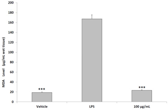 The reported anti-inflammatory effects were consistent with previously published papers, that showed the capability of pollen to inhibit the production of IL-8 [5] and the activities of cyclooxygenase (COX)-2 and inducible nitric oxide synthase (iNOS), evaluated as a reduction of PGE2 and nitrites levels, respectively [37,38,39]. In the present work, together with the expression of NFκB, we also indirectly evaluated the activity of both enzymes. Actually, the inhibitory effect on NFκB gene expression could explain, albeit partially, this multitarget anti-inflammatory role. NFκB is a transcriptor factor involved in the expression of cytokines and inflammatory enzymes such as iNOS and COX-2 [40,41]. Previously, we reported the capability of a hydroalchoholic chamomile extract, containing a significant polyphenolic fraction, to simultaneously inhibit NFκB, PGE2, and nitrites pathways, in tissue specimens challenged with LPS [9]. The anti-inflammatory effects displayed by pollen ex vivo further confirm its efficacy for the prevention of prostatitis [4]. We also evaluated the effect of pollen supplementation (100 μg/mL) on lipid peroxidation, finding a significant reduction of MDA levels in pollen-treated group, compared to LPS group (Figure 5). MDA is a marker of lipid peroxidation mainly produced in the pathway NO-myeloperoxidase-MDA, in which NO levels were significantly increased during inflammatory process through the up-regulation of inducible iNOS [39].