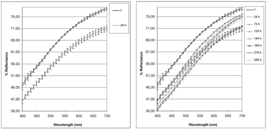 The samples showed a pale but dominant yellow colour, as demonstrated by the high value of L* (86.05), the low a* value (1.71), and the positive b* value (11.96), that both slightly darken in the first 24 h of storage at 55 °C, as shown by a decrease of L* and overlapping a* and b* values (81.14, 1.75, 12.05, respectively). The next measurements, as better demonstrated in Figure 6 where reflectance curves of the samples stored at 55 °C for up to twelve days (288 h) were reported, evidenced that, for times longer than 24 h, the browning process stopped (as well as demonstrated by the slopes between 600 and 700 nm), but that of red and yellow components rose, with a curve lowering in the region 400–550 nm (Figure 6).