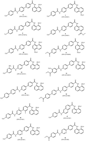 - Margolles-Clark, E.; Kenyon, N.S.; Ricordi, C.; Buchwald, P. Effective and specific inhibition of the CD40–CD154 costimulatory interaction by a naphthalenesulphonic acid derivative. Chem. Biol. Drug Des. 2010, 76, 305–313. [Google Scholar] [CrossRef] [PubMed]
