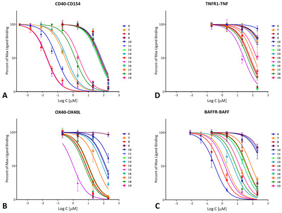 Concentration-dependent inhibition of TNF superfamily PPIs by the compounds of the present study (6–19; Table 1) in a cell-free ELISA-type assay. Data are (counterclockwise) for human CD40–CD154 (CD40L) (A); OX40–OX40L (B); BAFFR–BAFF (C); and TNF-R1–TNFα (D) and were fitted with standard binding curves. Data are average ± SD (normalized to percent binding) for n = 3 independent experiments with duplicates for each condition.