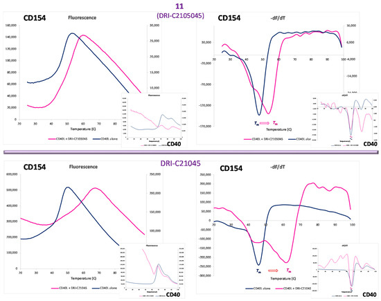 This assay was used following standard protocols as described in the literature [63,64] to establish whether CD154 or CD40 is the binding partner of our compounds. Sypro orange (ThermoFisher; Waltham, MA, USA) was used as the fluorescence detection dye with an RT-PCR machine (StepOnePlus, Applied Biosystems (Foster City, CA, USA); detection on ROX channel, 575/602 nm) programmed to equilibrate samples at 25 °C for 90 s and then increase temperature to 99 °C by 0.4 °C every 24 s before taking a reading. Melting point of the protein is considered the lowest point of the first derivative plot, as calculated by the software included with the RT-PCR machine. Optimal concentrations were determined by performing a series of preliminary scans at various concentrations of protein, compound, and dye (CD154 0.05 mg/mL, CD40-Fc 0.1 mg/mL, Sypro orange 4×, 100 mM HEPES buffer, 10 μM of DRI-C21045 and 25 μM of 11).