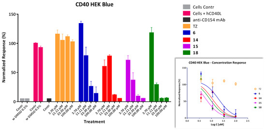 As further confirmation of the inhibitory activity of our compounds, a cell-based assay was used with sensor cells (HEK Blue CD40) containing a secreted embryonic alkaline phosphatase (SEAP) reporter gene under the control of a promoter fused to a NF-κB binding site and transfected with CD40. In these cells, secretion of SEAP is specifically induced by the binding of CD154 to its cell-surface receptor (CD40) and the downstream activation of the corresponding NF-κB pathway. Several tested compounds such as 6, 14, 15, and 18 showed concentration-dependent inhibition, as shown in Figure 5, with activities in the low micromolar range as estimated from fitting of standard sigmoid response functions (Table 1). For all tested compounds, the corresponding IC50 values are higher than those determined in the cell-free binding inhibition assay (Table 1) representing a loss of activity which is likely due to non-specific binding on account of the presence of proteins and cells in the assay, as well as hydrophobicity-related problems. Cytotoxicities were also evaluated in these same cells and at the same concentrations using a standard MTS assay to ensure that effects are present at non-toxic concentration levels. LC50 estimates obtained from fitting of standard inhibitory curves were higher than 300 μM for all compounds except 14 (55.6 μM) and 18 (131 μM) that showed some signs of toxicity and, hence, a lower safety margin (e.g., therapeutic index, TI = LC50/IC50 [66], of 5 and 15, respectively).