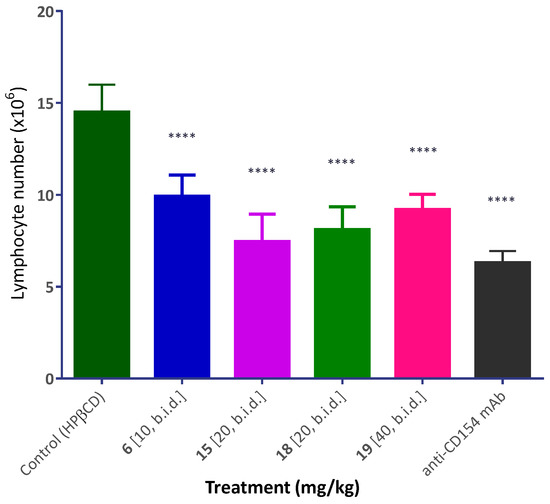 The most promising compounds of the present series were evaluated for in vivo activity using the same model of alloantigen-induced T cell expansion in the draining lymph nodes (DLNs) that was described before [56]. This procedure involved injection of splenocytes isolated from DBA-2 mice into the footpad of Balb/c recipients. Within three full days, this causes a significant increase in the number of cells in the draining popliteal lymph node, and this is inhibited by compounds with immunosuppressive activity. Several compounds such as 6, 15, and 18 (10–20 mg/kg; s.c.; b.i.d.) showed highly significant inhibitory activity (p < 0.0001) and at a level approaching that of the MR-1 anti-CD154 antibody used as positive control (Figure 6).