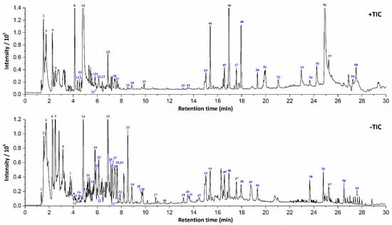The representative total ion current chromatogram (TIC) of Bolbostemma paniculatum extracts in positive and negative ESI modes.