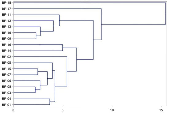 Dendrograms of hierarchical cluster analysis (HCA) for 18 batches of Bolbostemma paniculatum based on the five investigated markers.