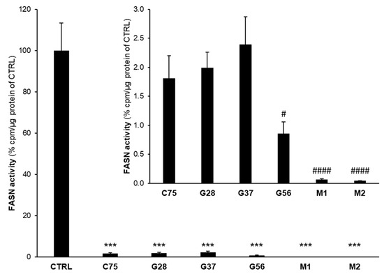 The capacity of G28, G37, G56 [21,22], M1 and M2 [26] to block FASN enzymatic activity in MDA-MB-231 cells was analyzed after a 48-h treatment with a concentration equal to the IC50 value of each compound. The inhibition is represented as the percentage of remaining activity with respect to untreated cells (Figure 2). The previously reported FASN-specific inhibitor C75 (IC50 = 46.6 ± 2.2 µM in MDA-MB-231 [13]) was used as a positive control.