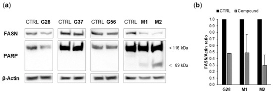 In parallel, in order to check whether the observed FASN activity decrease was related to changes in FASN protein levels, cells were treated with diesters and monoesters as described in the next Section 2.4 and FASN expression was analyzed by Western blot (Figure 3a). G37 and G56 did not modulate FASN protein levels, whereas G28 and its derivatives M1 and M2 displayed a tendency to reduce such levels (Figure 3b), which was more noticeable for M2.