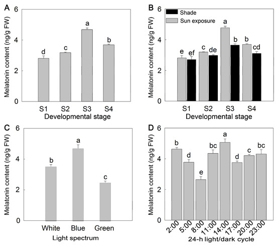 Changes in melatonin content in P. lactiflora ‘Zi Fengyu’ flowers. (A) Effect of the flower developmental stage on the melatonin content in P. lactiflora flowers. (B) Effect of shade on the melatonin content in P. lactiflora flowers. (C) Effect of different light spectrums on the melatonin content in P. lactiflora flowers. (D) Effect of the 24-h light/dark cycle on the melatonin content in P. lactiflora flowers. S1, flower-bud stage; S2, initiating bloom; S3, bloom stage; S4, wither stage. The values represented the means ± SDs, and different letters indicate significant differences according to Duncan’s multiple range test (p < 0.05).