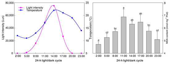 Changes in light intensity, temperature and malonyldialdehyde (MDA) content during the 24-h light/dark cycle. The values represented the means ± SDs, and different letters indicate significant differences according to Duncan’s multiple range test (p < 0.05).
