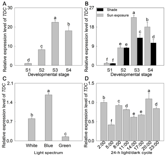 Changes in the relative expression level of TDC in P. lactiflora ‘Zi Fengyu’ flowers. (A) Effect of the flower developmental stage on the relative expression level of TDC in P. lactiflora flowers. (B) Effect of shade on the relative expression level of TDC in P. lactiflora flowers. (C) Effect of different light spectrums on the relative expression level of TDC in P. lactiflora flowers. (D) Effect of the 24-h light/dark cycle on the relative expression level of TDC in P. lactiflora flowers. S1, flower-bud stage; S2, initiating bloom; S3, bloom stage; S4, wither stage. The values represented the means ± SDs, and different letters indicate significant differences according to Duncan’s multiple range test (p < 0.05).