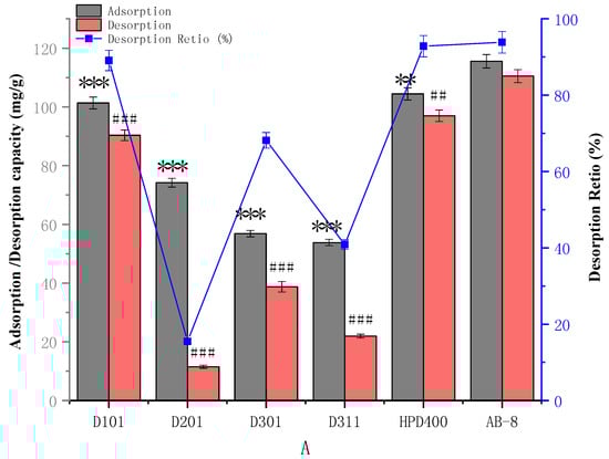 3.3.1. Adsorption and Desorption Capacities, Desorption Ratio