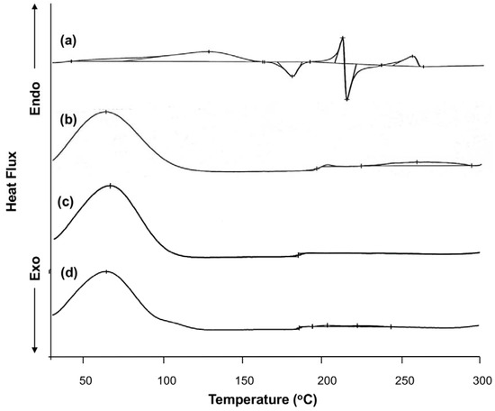 Differential scanning calorimetry thermograms of baicalin (a), HP-β-CD (b), the inclusion complexes prepared by conventional solution mixing (c), and the inclusion complexes prepared by supercritical fluid encapsulation (d).