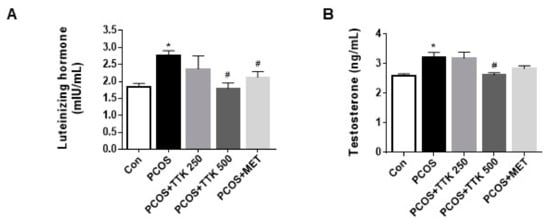 Comparison of the mean levels of luteinizing hormone, testosterone, and estradiol in the different treatment groups. The rats were divided into five groups (Con, PCOS, PCOS + TTK250, PCOS + TTK500, and PCOS + MET). The serum levels of (A) luteinizing hormone, (B) testosterone, and (C) estrogen were assessed by enzyme-linked immunosorbent assay. * p < 0.05 compared with the vehicle group (Con); # p < 0.05 compared with the PCOS group. Con, control; PCOS, polycystic ovary syndrome; MET, metformin.