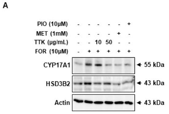 NCI-H295R cells were plated at 2 × 105 cells/dish in 60-mm culture dishes 24 h before drug treatment. Cells were then treated with 10 μM FOR in the presence or absence of TTK extract, metformin, or pioglitazone for 24 h. Cells were lysed with Laemmli sample buffer (Bio-Rad, Hercules, CA, USA), heated at 100 °C for 5 min, and electrophoresed with 25~30 µg protein/lane on denaturing sodium dodecyl sulfate-polyacrylamide (SDS-PAGE) gels. Proteins were transferred to nitrocellulose membranes (GE Healthcare UK Ltd., Buckinghamshire, Germany) using a Bio-Rad tank blotting apparatus (Bio-Rad). The protein-blotted membranes were probed with specific targeting primary antibodies, washed, and incubated with horseradish peroxidase-linked secondary antibodies. After the membranes were washed three times, the signals were detected with EzWestLumi One enhanced chemiluminescence solution (Atto Corporation, Tokyo, Japan) using a Fujifilm LAS-3000 (Fuji Photo, Tokyo, Japan).