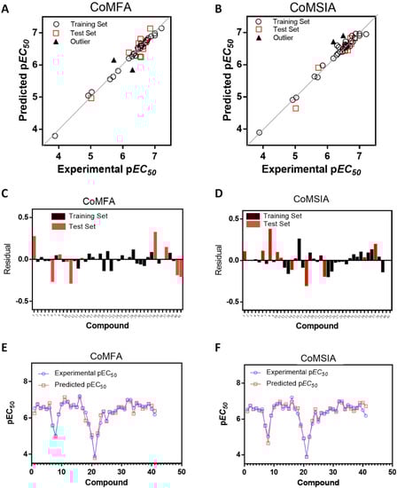 Plots of experimental versus predicted pEC50 values for the training and test set molecules for CoMFA (A) and CoMSIA (B) models. Residual plots between predicted and experimental values for CoMFA (C) and CoMSIA (D); CoMFA (E) and CoMSIA (F) predictions for every molecule in the complete set.