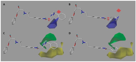 CoMFA and CoMSIA studies were performed with Sybyl X-1.2 software (1.2, Tripos International, St. Louis, MS, USA) installed in a Windows 10 environment on a PC with an Intel Core i7 CPU. To acquire the best conformers for each molecule, every compound was drawn in ChemDraw and subjected to a preliminary geometry optimization using MM2 molecular mechanics as is implemented in ChemBio3D software (15.1.0, PerkinElmer, Waltham, MA, USA). Following this, the structure of compound 16 (the most active of the series) was further minimized by quantum mechanics using the DFT B3LYP/6.311+g** method in Gaussian software (09, Gaussian Inc., Wallingford, CT, USA). This structure was used as a template for the alignment. The mol2 structures were imported to Sybyl and MMFF94 charges were assigned to each atom. The minimized structures were superimposed by the atom-by-atom fit method choosing the aryloxypropanolamine nucleus as the common scaffold for alignment (Figure 5). In addition, a minimization was carried out based on the Powell method [35] (as implemented in Sybyl, Figure S1 in the Supplementary Material). However, the statistical results were much lower than those reported by the method used in this manuscript (Table S3 in the Supplementary Material).