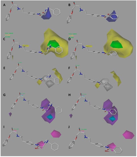 CoMSIA electrostatic (A,B); steric (C,D); hydrophobic (E,F); donor (G,H) and acceptor (I,J) contour maps around compounds 16 (left) and 21 (right), the most active and less active of the series respectively. The colors in A–D have the same meaning as in the CoMFA contour maps. Hydrophobic favored areas are in yellow and unfavorable areas in grey (E,F). Donor and acceptor favored areas are in cyan and magenta respectively, and donor and acceptor unfavorable areas are in purple and red, respectively (G–J).