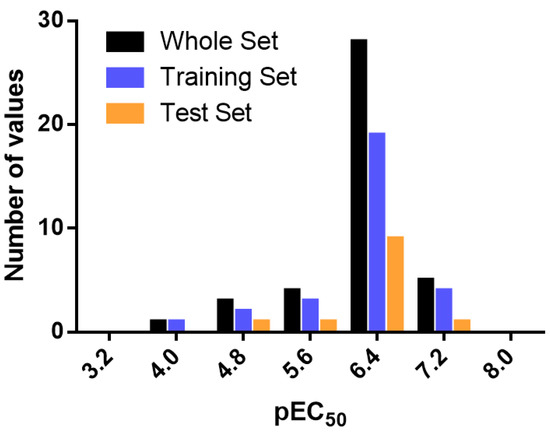 CoMFA and CoMSIA studies were performed on a set of 41 phenoxypropanolamine derivatives reported by Astellas Pharma [29,30] (Table 6). The derivatives displayed potent agonistic activity at the β3-AR. Agonistic activity (EC50) was assessed by measuring cAMP accumulation in CHO cells expressing β3-ARs. The EC50 values were converted to pEC50 (−logEC50). Several combinations of training and test sets were evaluated. The compounds were manually and randomly divided into training (29 compounds, 70%) and test sets (12 compounds, 30%), ensuring that both sets contained structurally diverse compounds with high, medium, and low activity, and a uniform distribution to avoid possible problems during external validation. For this purpose, most of the test set compounds were randomly extracted from the range of 6–8 logarithmic units of pEC50, while a smaller number were randomly selected from the range of 4–6 logarithmic units. Several test set groups were evaluated. For the construction of the final models, the test set that generated the highest r2 value in each case (CoMFA and CoMSIA) was finally selected. The distribution of pEC50 values for the whole set, the training set, and the test set is shown in Figure 6. In all three cases, the biological activity followed a Gaussian distribution. The range of the biological activities spans 3.5 log units, from 3.89 to 7.37.