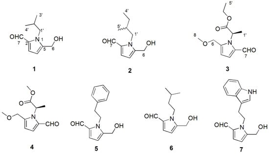 - Compagnone, R.S.; Oliveri, M.C.; Piãna, I.C.; Marques, S.; Rangel, H.R.; Dagger, F.; Suárez, A.I.; Gómez, M. 5-alkylpyrrole-2-carboxaldehydes from the caribbean sponges mycale microsigmatosa and desmapsamma anchorata. Nat. Prod. Lett. 1999, 13, 203–211. [Google Scholar] [CrossRef]
