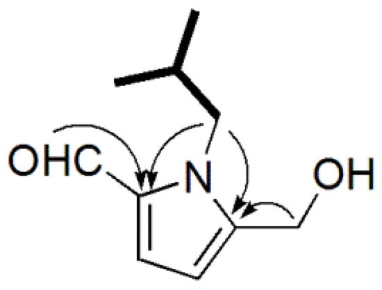 Compound 1, was purified as a white powder, and has a molecular formula of C10H15NO2 which was deduced by a HRESIMS quasimolecular ion at m/z 204.0997 [M + Na]+ (calculated for C10H15NO2Na, 204.1000). It had an IR absorption band at 1647 cm−1, which suggested the presence of an unsaturated carbonyl group. An absorption band at 291 nm in the UV spectrum of compound 1 was indicative of a pyrrole-2-aldehyde moiety [14]. The 1H-NMR spectrum (Table 1, supplementary material Figure S1) displayed a set of two mutual coupled protons at δH 6.98 (1H, d, J = 4.2 Hz, H-3) and 6.23 (1H, d, J = 4.2 Hz, H-4), which indicated the presence of a typical 2,5-disubstituted pyrrole ring [15,16]. The presence of an aldehyde group in compound 1 was supported by the NMR signals at δH 9.44 (1H, s) and δC 179.5. Two oxygenated protons at δH 4.50 (s, 2H), together with the downfield methylene carbon signal at δC 55.6, suggested the existence of a hydroxymethyl group. 1H-NMR signals of δH 0.80 (6H, d, J = 7.2 Hz, overlapped, H-3′/4′), 2.00 (1H, m, H-2′), 4.11 (2H, d, J = 7.8 Hz, H-1′), and 13C-NMR APT (Table 1, supplementary material Figure S2) signals of δC 19.9 (overlapped), 30.1, and 51.9 indicated the presence of an isobutyl moiety, which was further confirmed by 1H-1H COSY correlations of H-3′/H-2′/H-1′ (Figure 2). In the HMBC spectrum (Figure 2), the aldehyde proton had a long-range correlation with C-2 (δC 132.4), while hydroxymethyl protons showed enhancements with C-5 (δC 144.5), which suggests that the two groups were located at C-2 and C-5 of the pyrrole ring, respectively. The isobutyl side chain was attached to the N atom on the basis of HMBC correlations from H-1′ (δH 4.11) to C-2 and C-5, together with the downfield methine carbon of C-1′ (δC 51.9). Thus, the entire structure of compound 1 was elucidated as 1-isobutyl-2-formyl-5-hydroxymethylpyrrole, and given the trivial name phlebopine A.