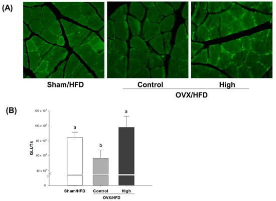 Confocal immunohistochemical analysis of (A) soleus muscle GLUT4 protein and (B) its quantification in OVX/HFD rats. Rats were orally administered with saline or 300 mg/kg of Soy-Hop for 8 weeks, showing increased GLUT4 translocation to the membrane surface by Soy-Hop. Sham, sham-operation; OVX, ovariectomized; HFD, high-fat diet; High, 300 mg/kg Soy-Hop; GLUT4, glucose transporter 4. Values are presented as the means ± SEM (n = 10 per group). Bars with different letters are significantly different at p < 0.05 as analyzed by Duncan’s multiple comparison test.