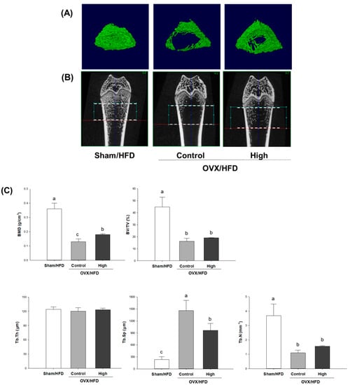 Micro-computed tomography analysis of distal femoral epiphysis in (A) two-dimensional plane, (B) three-dimensional reconstruction, and (C) its quantification in OVX/HFD rats. Rats were orally administered with saline or 300 mg/kg of Soy-Hop for 8 weeks, showing noticeable changes in the porosity of the bone microarchitecture and decreased trabecular separation by Soy-Hop, Sham, sham-operation; OVX, ovariectomized; HFD, high-fat diet; High, 300 mg/kg Soy-Hop; BMD, bone mineral density; BV/TV, bone volume percent; Tb.Th, trabecular thickness; Tb.Sp, trabecular space; Tb.N, trabecular number. Values are presented as the means ± SEM (n = 10 per group). Bars with different letters are significantly different at p < 0.05 as analyzed by Duncan’s multiple comparison test.