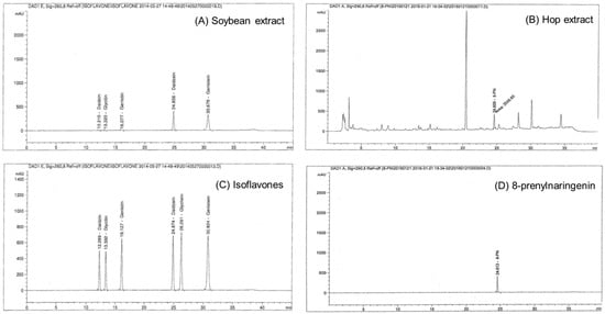 The Soy-Hop was kindly provided by Pulmuone Co., Ltd. (Seoul, Korea). Briefly, soybeans (Glycine max L.) were extracted with ethanol at 60–70 °C for 2 h, concentrated under reduced pressure and then spray-dried. Hops (Humulus lupulus L.) were extracted with ethanol supercritical carbon dioxide, followed by concentration and spray-drying. Each powder was mixed at a ratio of 7:12 to form a test material. Isoflavones and prenylflavanones were analyzed using a high-performance liquid chromatography system equipped with a UV detector (Agilent technologies, Santa Clara, CA, USA) and a Shiseido Capcell Pak C18 column (250 × 4.6 mm, 5 µm; Shiseido, Tokyo, Japan). For isoflavones, the mobile phase was changed from 90% A for 0–21 min, 60% A for 21–35 min, 40% A for 35–36 min, and 90% A for 36–45 min, where solvent A is 2% acetic acid in 10% methanol and solvent B is 2% acetic acid in methanol. For prenylflavanones, the mobile phase was changed from 75% A for 4–30 min, 20% A for 30–33 min, and 100% B for 35–45 min, where solvent A is water and solvent B is 0.1% formic acid in acetonitrile. Soybean extract was standardized with isoflavones (sum of daidzein, genistein, glycitein, daidzin, genistin, and glycitin) at a concentration of 300–350 mg/g, and hop extract was standardized with 8-prenylnaringenin at a concentration of 1.5–2.5 mg/g (Figure 3).