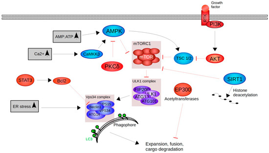 Mechanisms of autophagy-induction. The mTORC1 complex is a central regulator of autophagy-initiation. If active, mTORC1 inhibits the ULK1 complex and its ability to recruit the Vps34 complex to the phagophore. The binding of the Vps34 complex is essential for lipidation of LC3, autophagosome formation, fusion and consequent cargo degradation. Cellular stressors (shown in grey), such as ER stress, increasing intracellular Ca2+ levels and the shift of energy levels (increase of the AMP:ATP ratio) influences autophagy initiation either upstream of mTORC1 or directly at the Vps34 complex. Other positive regulators of autophagy (shown in blue) include SIRT1 and TSC1/2 signalling. Negative regulators of autophagy (shown in red) comprise PI3K/Akt, STAT3/Bcl2, PKCδ and EP300.