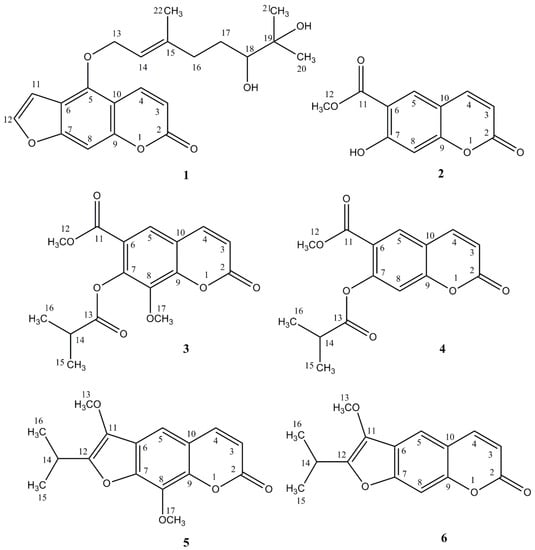 - Chinou, I.; Widelski, J.; Fokialakis, N.; Magiatis, P.; Glowniak, K. Coumarins from Peucedanum luxurians. Fitoterapia 2007, 78, 448–449. [Google Scholar] [CrossRef] [PubMed]