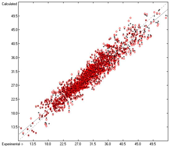 Correlation diagram of the surface-tension data (in dyn/cm). Cross-validation data are added as red circles. (N = 1833; R2 = 0.9039; Q2 = 0.8823; regression line: intercept = 2.8653; slope = 0.9049).