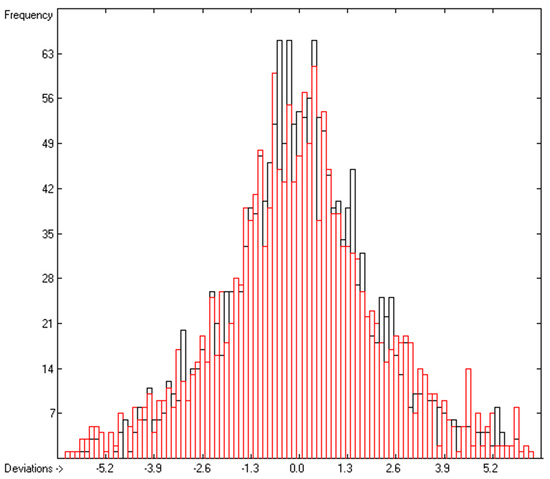 Histogram of the surface-tension data. Deviations are in dyn/cm. Cross-validation data are superpositioned as red bars. (S = 2.16; experimental values range: 9.89—53.5 dyn/cm).