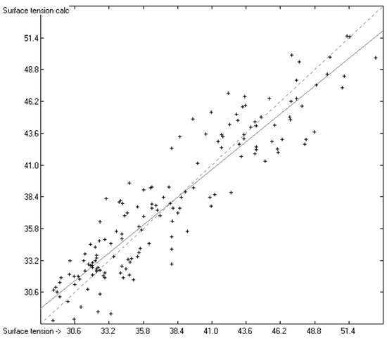 Correlation diagram of the surface-tension data of the ionic liquids (in dyn/cm). (N = 154; R2 = 0.8579).