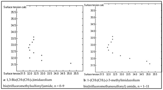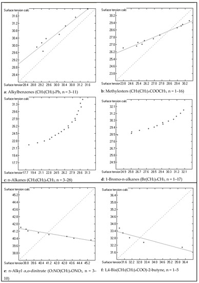 The second observation, disguised behind the range of the standard deviation, reveals an important shortcoming of the present prediction method. A small set of compound classes, characterized by the common feature of carrying a homologous sequence of linear methylene chains, exhibits an unexpected deviation of the experimental sequence of surface-tension data from the calculated values, whereas other analogous classes of homologues show fairly normal correlation between experiment and prediction. Typical examples of the latter normal correlation sequence are n-alkylbenzenes [3] (chart a in Figure 4), methylesters of long-chain carboxylic acids [35] (chart 4b), 1-alkanols [36], and 1-alkylthiols [37], which only deviate from the ideal correlation by slightly differing slopes. In contrast to this, the sequence of the experimental surface-tensions in the homologous n-alkane series [38] (chart 4c) is nonlinear and seems to aim at a constant maximum with increasing chain length. Analogous nonlinearity with increasing chain length was found for 1-alkenes [38] and 1-bromoalkanes [39] (chart 4d). A nearly linear but inverse correlation was found for a methylene chain homologue substituted at both ends by a nitrate group [40] (chart 4e). This characteristic feature was also found for the homologues of α,o-dibromo-n-alkane [41] and 1,4-Bis(n-alkylcarbonyloxy)-2-butyne [42] (chart 4f). Quite a bizarre surface-tension sequence was revealed by the symmetrical (chart a in Figure 5) and asymmetrical (chart 5b) homologues of the ionic liquids 1,3-Bis(n-alkyl)imidazolium and 1-n-alkyl-3-methylimidazolium bis(trifluoromethylsulfonyl)amide [5,33,34], respectively. It is obvious that the present atom-group additivity approach is not able to treat these highly heterogeneous sequences. The reason behind these deviations has been described by Fowkes [4] as a result of anisotropism on the liquid surface caused by the extensive molecular directional orientation of these compounds, leading to a correlated molecular orientation (CMO). However, Fowkes only related his CMO thesis to linear n-alkanes; its extension to compounds with various substitutions inside or at the end of the methylene chains remains open to further studies. Since the CMO effect is generally small in relation to the other attractive forces on the liquid surface—Fowkes evaluated a range of between 0 for hexane and 2.89 dyn/cm for hexadecane, i.e., ca. 10% of the total force for the largest n-alkane in the series—the maximum range of the surface tension of all these homologous series remained within the deviation limits to allow all of their members to stay included in the parameters calculation. As a consequence, however, the present atom-group additivity method at best provides an average value for the surface tension of these homologues.