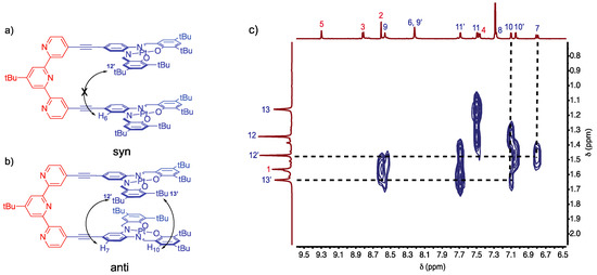 (a,b) Molecular structure of the syn- and anti-conformations and (c) 1H NOESY Spectrum (400 MHz, 300 K) of 1 in CDCl3 showing the correlation peaks between H-7/H-12′ and H-10/H-13′ indicative of a closed stacked anti-conformation.