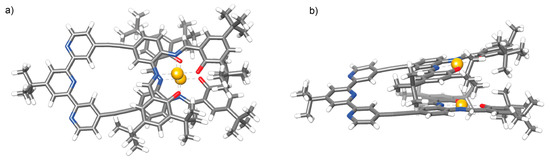 Diffusion ordered NMR spectroscopy (DOSY) experiments were also performed in CDCl3 at 300 K to provide additional evidence for the binding of coronene. The diffusion coefficients of tweezers 1 and coronene are 9.06 × 10−10 m2·s−1 and 1.38 × 10−9 m2·s−1, respectively, whereas the 1:1.5 mixture presents values of 6.79 × 10−10 m2·s−1 for 1 and 1.31 × 10−9 m2·s−1 for the coronene. The diffusion coefficient of the coronene is slightly lowered in the mixture, which indicates that a non-negligible amount of the guest is accommodated in the tweezers. The diffusion constant of Tweezers 1 is also significantly reduced by the presence of coronene, which suggests an increase in the hydrodynamic radius as expected from the intercalation of the guest that moves the Pt-salphen moieties apart. The exact binding mode for the complex [coronene ⊂ 1] was further clarified by DFT calculations (Figure 7c). In the optimized structure, the coronene is intercalated between the two Pt-salphen units with inter-planar π-distances that were calculated to be approximately 3.8 Å. The close proximity between the coronene and the diamino-phenylene and imine moieties of the salphen is consistent with the remarkable upfield shifts of NMR signals for the corresponding protons. The distance between the two salphens increased from 4.5 to 7.6 Å in the presence of the guest, which is in agreement with the increased hydrodynamic radius observed by DOSY as well as with the absence of correlation between protons H-7 and H-12′ and between H-10 and H-13′ in NOESY.