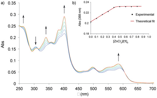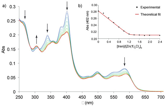 (a) UV-Vis titration of [Zn(1)2]Cl2 (5.0 × 10−6 mol·L−1) upon the addition of tren in CHCl3, after the opening with 0.5 equivalent of ZnCl2 and (b) Absorption at 402 nm and fitting with a 1:1 binding model.
